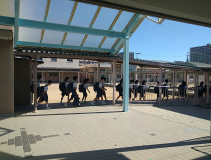 今日は、1年生の4クラスで、空調機故障のため、場所をエアコンの効く部屋に急遽、変更しました。。出席のあと、整列して学習する部屋に移動しています。1年生のみなさん、きちんと整列して移動ができましたね。4クラスのみなさん、ありがとうございます!