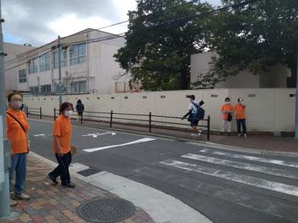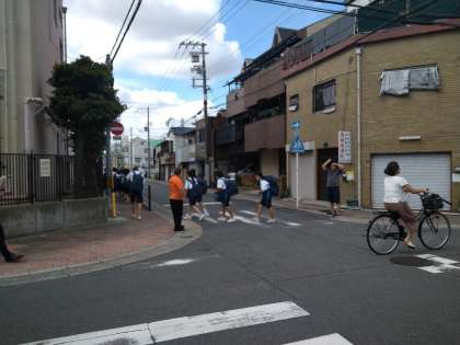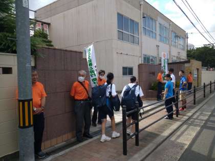 本日は、朝の登校時に城東区の保護司の方々が、あいさつ運動に参加してくださいました。