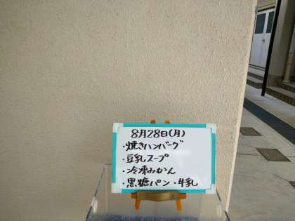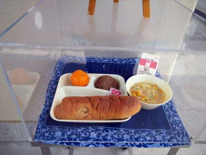 本日から給食が再開されました。今日のメニューは、焼きハンバーグ、豆乳スープ、みかん(冷)、黒糖パン、牛乳でした。