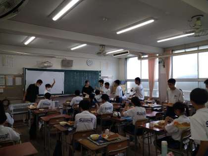 給食の配膳が終わり、今から食事がはじまります!おかわりヲシテする人も多いです。たくさん食べて、成長してください。