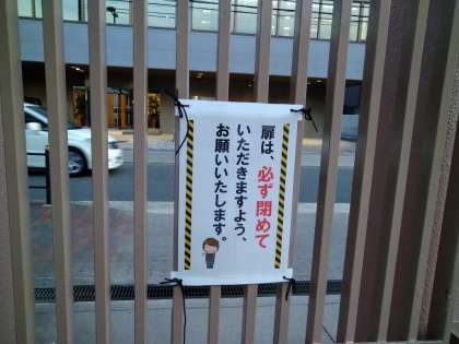 南門の掲示がリニューアルされました。ありがとうございます。防犯対策として、全ての門を閉じております。出入りの際、必ず、閉じていただきますよう、ご協力お願いいたします。