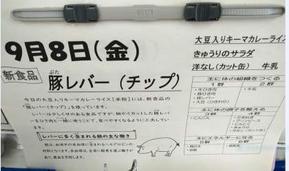 今日の大豆入りキーマカレーライス(米粉)には、新食品の「豚レバー(チップ)」を使っています。