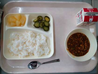 今日の給食メニューは、大豆入りキーマカレーライス(米粉)、きゅうりのサラダ、洋なし(カット缶)、牛乳でした。