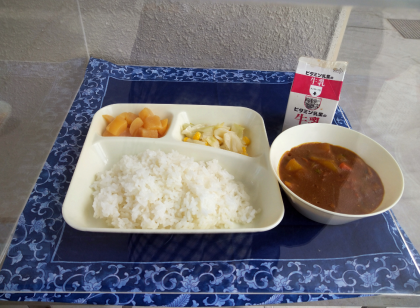 本日の給食のメニューは、チキンカレーライス(米粉)、キャベツとコーンのサラダ、白桃(カット缶)、牛乳でした。いつも栄養バランスを考えていただき、ありがとうございます。美味しく頂きました。「ごちそうさまでした。」