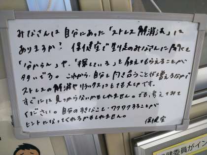 保健室前の掲示板が新調されました。今回は、「先生方のリフレッシュ・ストレス」の解消方法です!