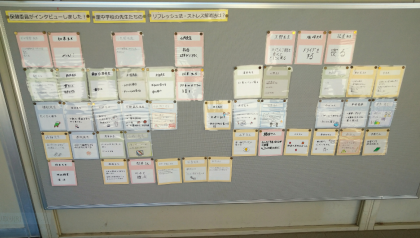 それぞれ先生方のリフレッシュ・ストレス解消方法が掲載されています。「食べる」・「寝る」が多かったように感じますが、中には、ユニークな意見もありました。みなさん、立ち止まって見てくださいね!この3連休は、どのように過ごされるのでしょうか?