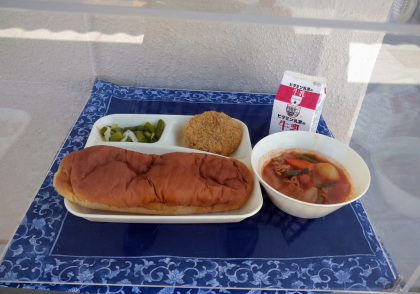 今日の給食メニューは、チキンレバーカツ、ケッチャップ煮、グリーンアスパラガスとキャベツのサラダ、黒糖パン、牛乳でした。