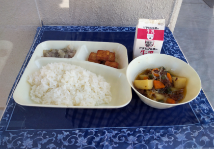 本日の給食のメニューは、肉じゃが、あつあげのみそだれかけ、キャベツの赤じそあえ、ごはん、牛乳でした。
