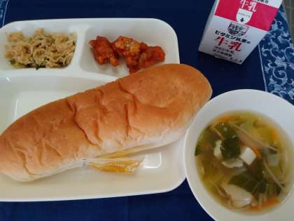 ☆給食室からこんにちは☆〜ヤンニョムチキン、とうふのスープ、切干しだいこんのナムル、コッペパン、マーマレード、牛乳〜