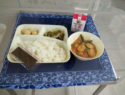 一口がんもとさといものみそ煮、牛肉と野菜のいためもの、みたらしだんご、ごはん、焼きのり、牛乳でした。