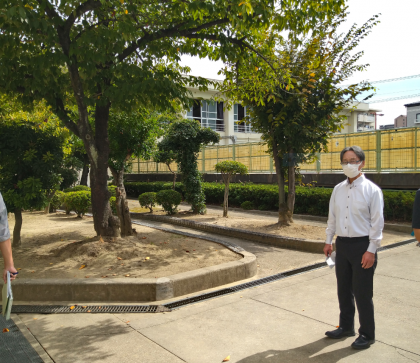 ※本日、プール工事の打ち合わせを行いました。校長先生の後ろの木々はもうすぐ見納めとなります。その時々の季節に応じて、きれいな花を見せてくれました木々ともしばし、お別れとなります。ありがとうございました。