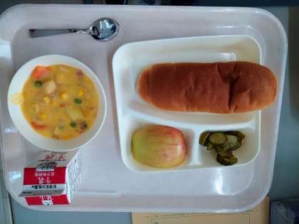 本日の給食のメニューは、豆乳コーンクリームシチュー(米粉)、きゅうりのバジル風味サラダ、りんご、コッペパン、アプリコットジャム、牛乳でした。
