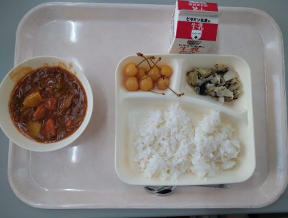 昨日の給食のメニューは、ハヤシライス(米粉)、キャベツのひじきドレッシング、さくらんぼ(缶)、牛乳でした。