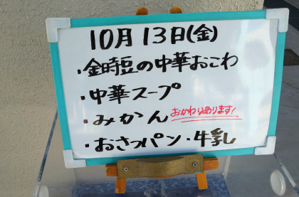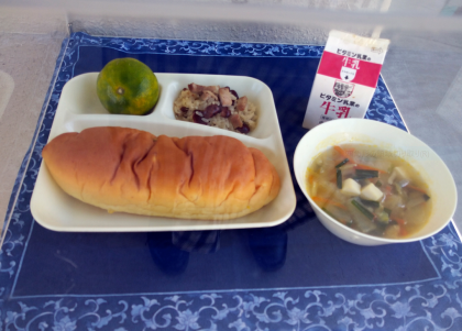 本日の給食のメニューは、金時豆の中華おこわ、中華スープ、みかん、おさつパン、牛乳でした。