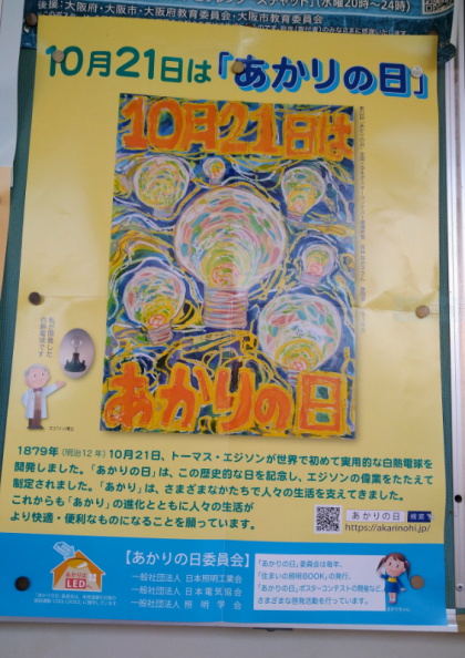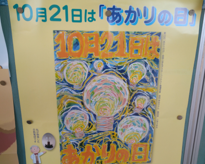 1879年(明治12 年)10 月21日アメリカのトーマス・エジソンが世界で初めて実用的な白熱電球を開発しました。エジソンの発明を記念し、10月21日を「あかりの日」としました。あかりは、家の中やお店の照明など、私たちの暮らしの中でとても役立っています。大事なエネルギーを無駄使いしないよう、使い方を考え、省エネを意識して、過ごしましょう。