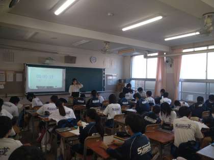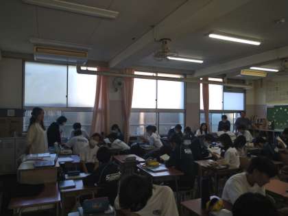 2年生は英語の授業でした。助動詞mustを含む文章でした。ICTを駆使し、単語確認、本文発音、教科書ワークの確認を行いました。元気よく発音ができていました。