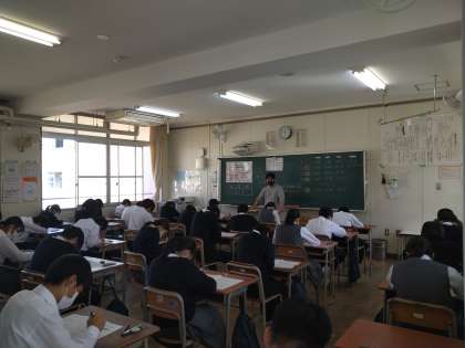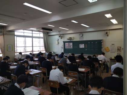 写真は、2限目の英語のテストの様子です。リスニング終了直後の様子です。このあと、数学・社会・理科が続きます。がんばってください。