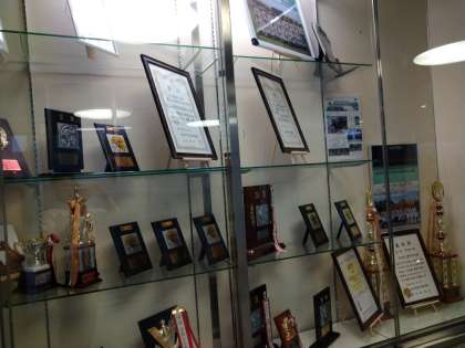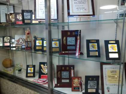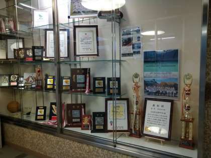 校内の玄関付近にある賞状・トロフィー等を飾っておりますガラスケースがきれいになりました!整理整頓を管理作業員の方々にしていただきました。ありがとうございました。