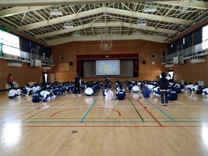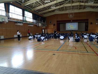 本日の4限目、1年生は校外学習の事前指導を体育館で行いました。