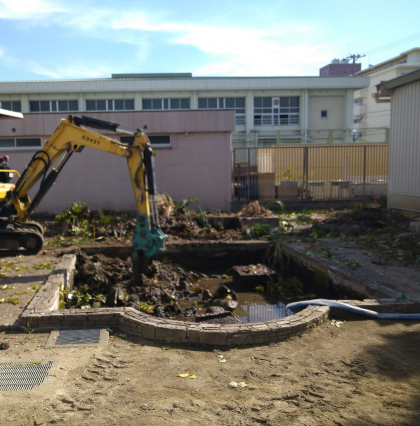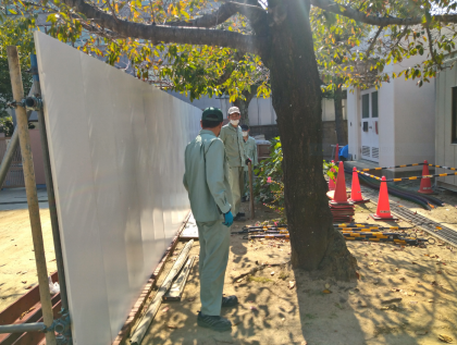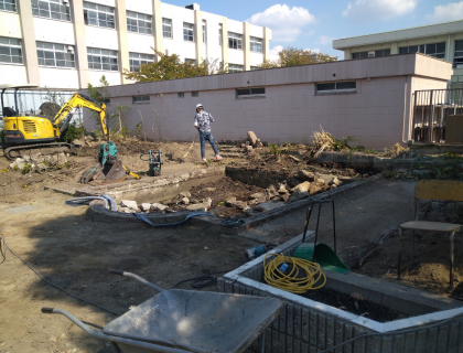 いつも管理作業員の方々が校内清掃を入念にしてくださっています。また、その隣では、中庭のプール工事が本格的に始まっております。