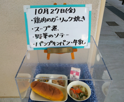 本日の給食のメニューは、鶏肉のガーリック焼き、スープ煮、
