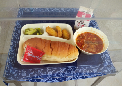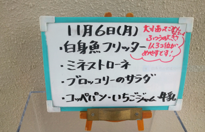 本日の給食のメニューは、白身魚のフリッター、ミネストローネ、ブロッコリーのサラダ、コッペパン、いちごジャム、牛乳でした。