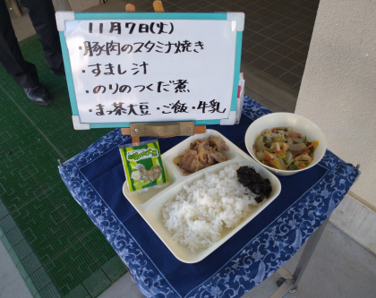 今日の給食のメニューは、豚肉のスタミナ焼き、すまし汁、のりのつくだ煮、まっ茶大豆、ごはん、牛乳でした。