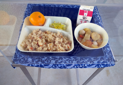 今日の給食のメニューは、関東煮、はくさいの甘酢あえ、みかん、かやくごはん、、牛乳でした。
