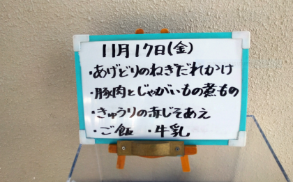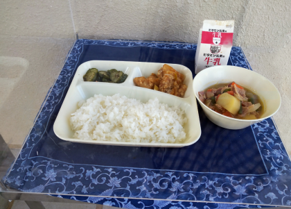 今日の給食は、あげどりのねぎだれかけ、豚肉とじゃがいもの煮もの、きゅうりに赤じそあえ、ごはん、牛乳でした。