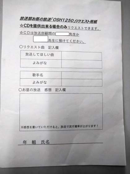 玄関ホールの落とし物BOXの上に、リクエストシートと受け入れBOXがございます。感想も添えて、リクエストすると、かけてくれる率もアップするようですよ!トライしてください。なお、CDは放送部顧問の先生に預けてくださいね。