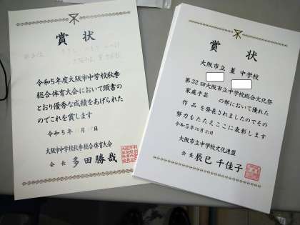ラグビーが大阪市秋季総体で3位に入賞しました。続いて、先月の総文祭で家庭手芸の部で数多くの方が表彰を受けました。家庭科部の共同作品も表彰を受けました。本校生徒の1名が、家庭科作品で全国大会出品します。受賞されたみなさん、「おめでとうございます!」