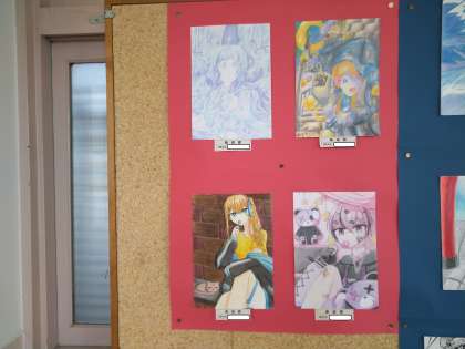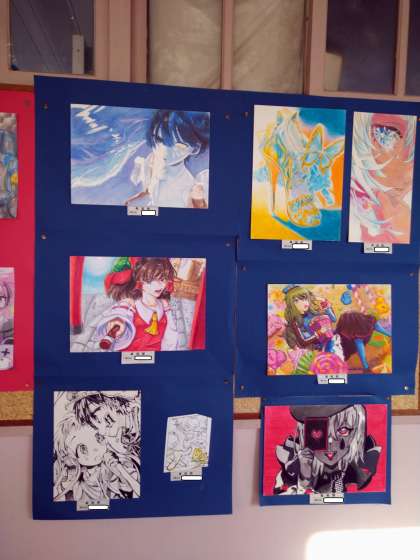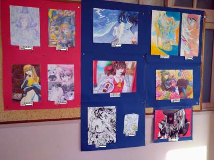 美術室の前に美術部の作品がズラリと並んでおります。どの作品も力作です。