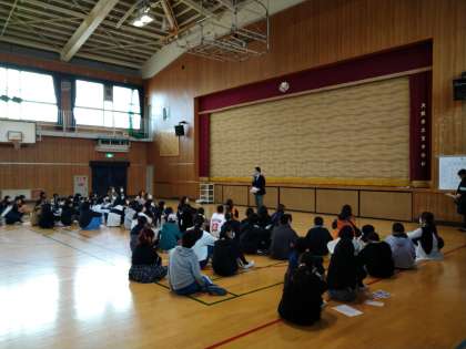 本校の標準服の紹介(生徒会のみなさんが着用してくれました) ならびに菫ブランドが定着している本校に、安心して入学をしてくださいとのお話がありました。あわせて、本校の高い学力は、家庭教育力の高さにあると感謝をされていました。
