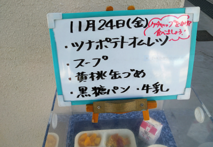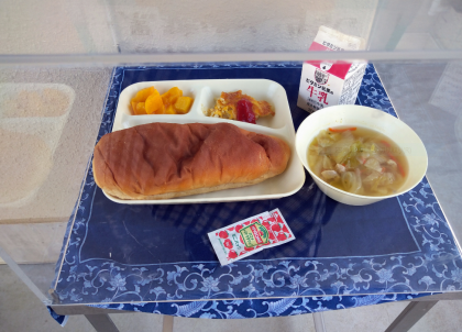 本日の給食のメニューは、ツナポテトオムレツ、スープ、黄桃(カット缶)、黒糖パン、牛乳でした。