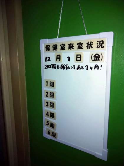 保健室前のホワイトボードの写真をお送りします。「2023年も残すところあと1か月!」みなさん、目標を持って頑張りましょう!!