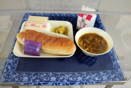 本日の給食は、カレーうどん、はくさいのおひたし、スライスチーズ、コッペパン、ブルーベリージャム、牛乳でした。