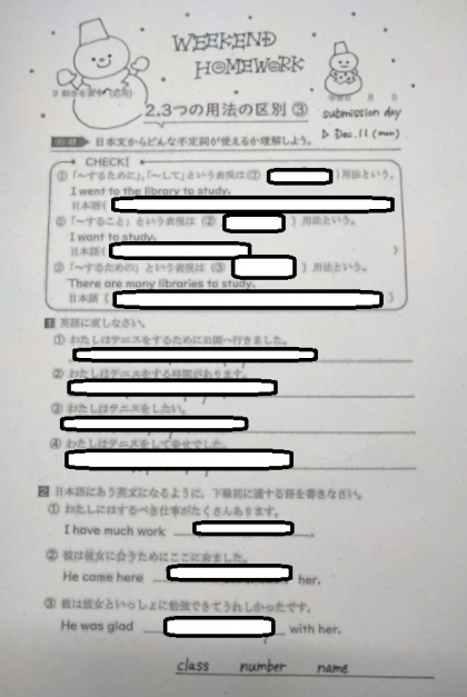 職員室の机上に、この時期を表すような絵が描かれたプリントを発見しました。写真を撮らせていただきました。英語の不定詞の問題がありました。