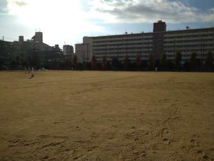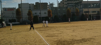 グラウンドでは、野球部が練習試合を行っています。しっかりと三振を奪う、ナイスピッチングが見られました。これから、攻撃に移ります。がんばってください!