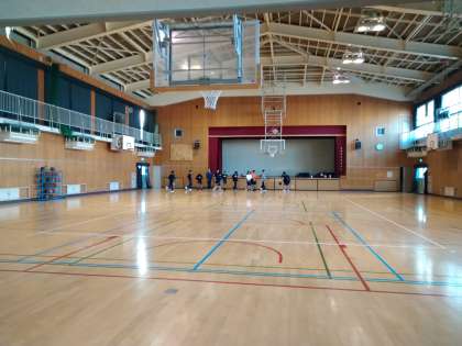 体育館では、バスケットボール部が練習はじまりのあいさつをしています。