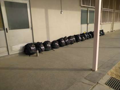 野球部は、本日は練習は行わず、大掃除をしています。野球部のかばんが、きれいに並べてあります。気持ちの良いものです。