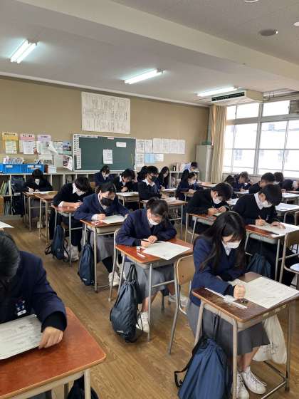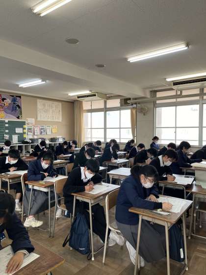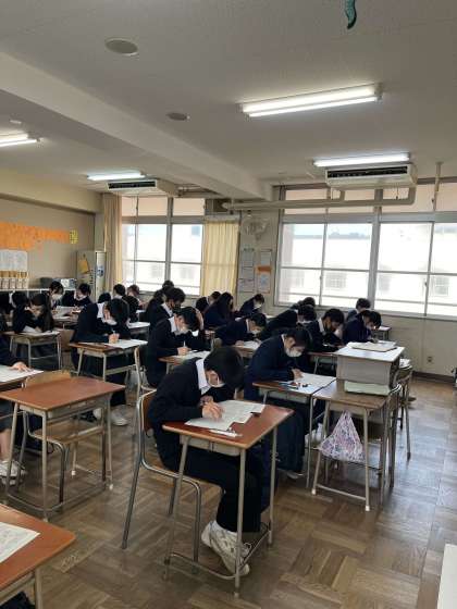 本日は、3年生最後の実力テストが行われました。入試前の学習の定着を再確認するテストです。満足いく出来でしたか?今日は、いつも以上に緊張感を持ちながら、テストに向き合うことができました。がんばれ、75期生!