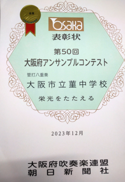 第50回大阪府アンサンブルコンテスト 管打八重奏での表彰でした。