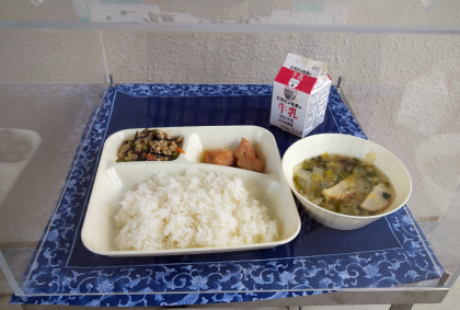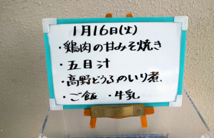 本日の給食のメニューは、鶏肉の甘みそ焼き、五目汁、高野どうふのいり煮、ごはん、牛乳でした。