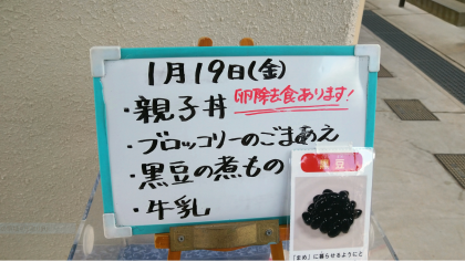 本日の給食のメニューは、親子丼、ブロッコリーのごまあえ、黒豆の煮もの、牛乳でした。