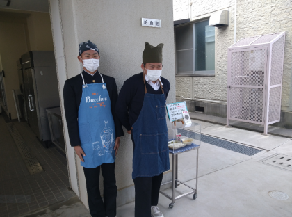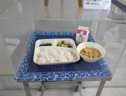 給食配膳前に、早く給食棟へ来てくれた方にモデルになっていただきました。ありがとうございます。「美味しそうです!」とのコメントをいただきました。