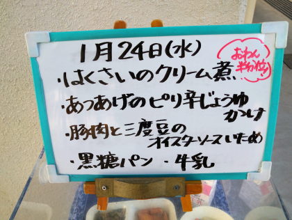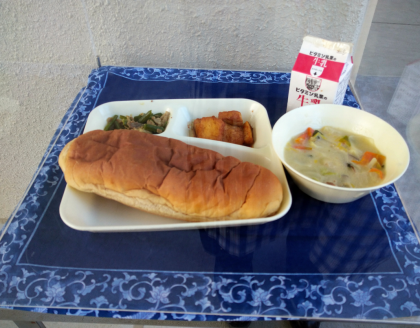 今日の給食メニューは、はくさいのクリーム煮、あつあげのピリ辛じょうゆかけ、豚肉お三度豆のオイスターソースいため、黒糖パン、牛乳でした。