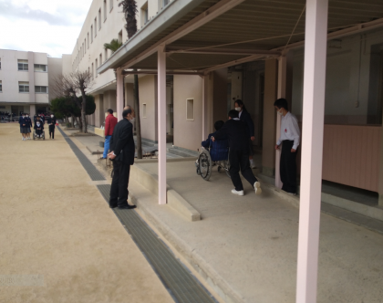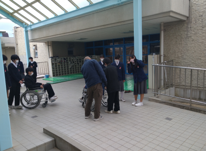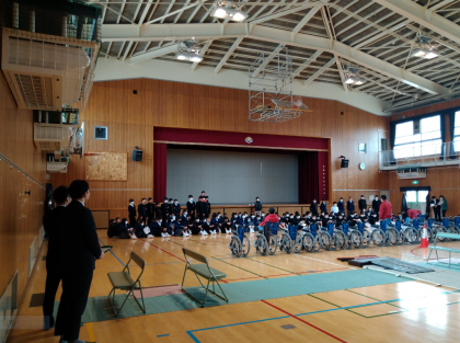 車いす自走体験を体育館で1時間、校内を周り、介助体験を1時間行いました。教育委員会からお二人の方々に来校していただき、取り組みの様子を見ていただきました。活動の様子を拝見され、「みなさん意欲的に取り組み、雰囲気がとても素晴らしいです。先生方の指導も行き届いており、とても好感の持てる集団ですね。」と嬉しいことばをいただきました!