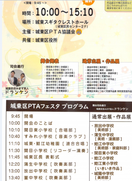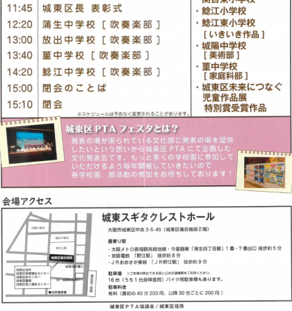 明日1/28(日)城東区のPTAフェスタが開催されます。本校からも多数出席、発表がございます。表彰されるみなさん、おめでとうございます。出演されるみなさん、よろしくお願いいたします。