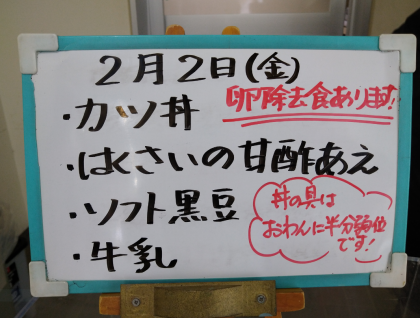 3年生のみなさんは、来週には受験が控えており、1・2年生のみなさんは、各種部活動の大会、また、学年末テストが今月末に控えております。カツ丼を食べ、勝ちを引き寄せましょう。