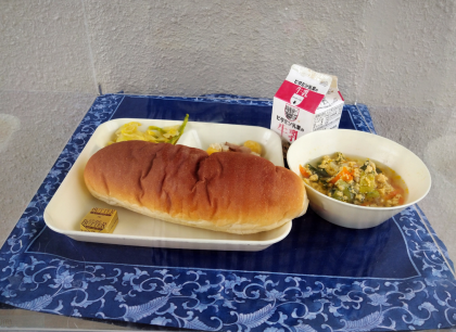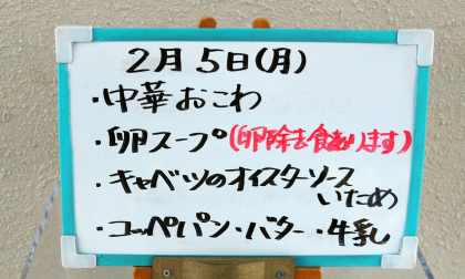 本日の給食のメニューは、中華おこわ、卵スープ、キャベツのオイスターソースいため、コッペパン、バター、牛乳でした。